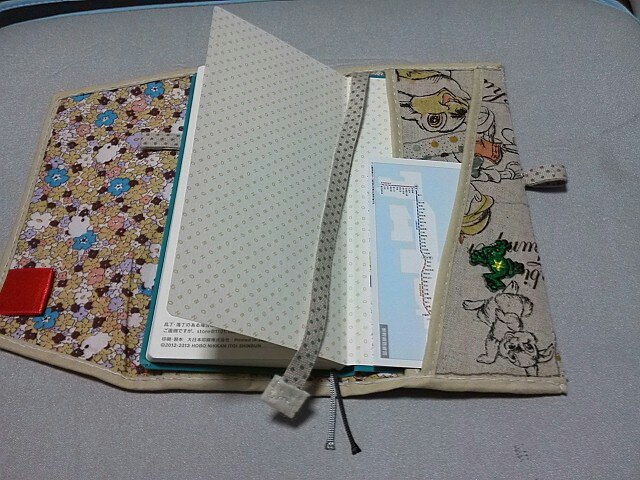というわけで完成ー(*´∀`*)ノ後ろ表紙にナナメポケットを入れ、しおりリボンを後ろ寄りにセットしました。